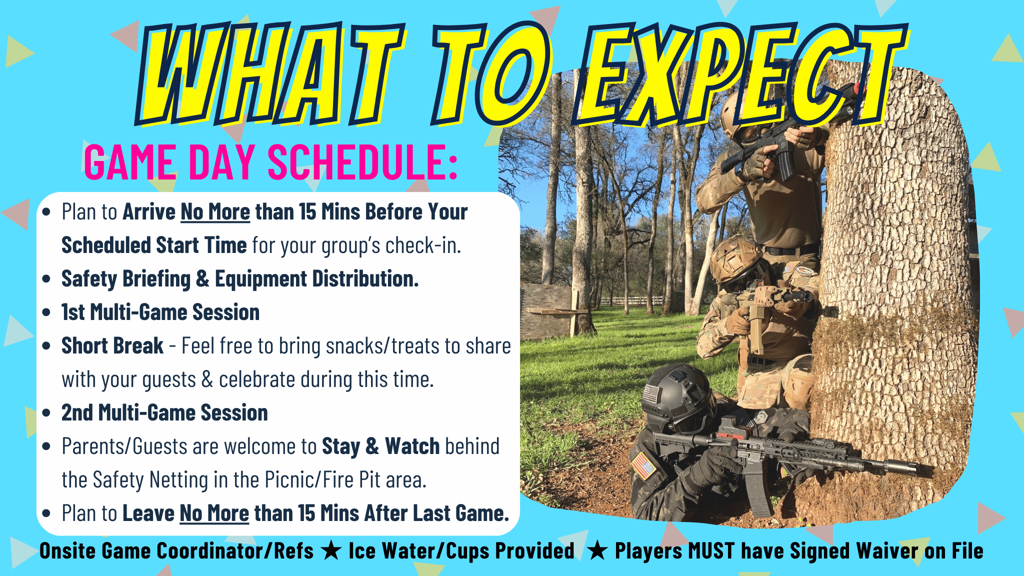 Download helpful images to include with your invitation to let guests know “Where to Go & What to Wear/Bring” & “Game Day Schedule”. Chose either the Gel Ball or Airsoft Images based on your Activity Booking. Don’t Forget to Also Share the Link to the Online Waiver!